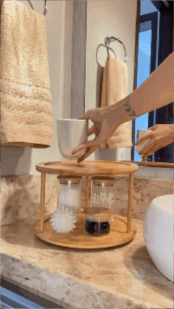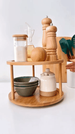 Con esta bandeja giratoria de doble nivel, todo queda visible, accesible y en su lugar.
